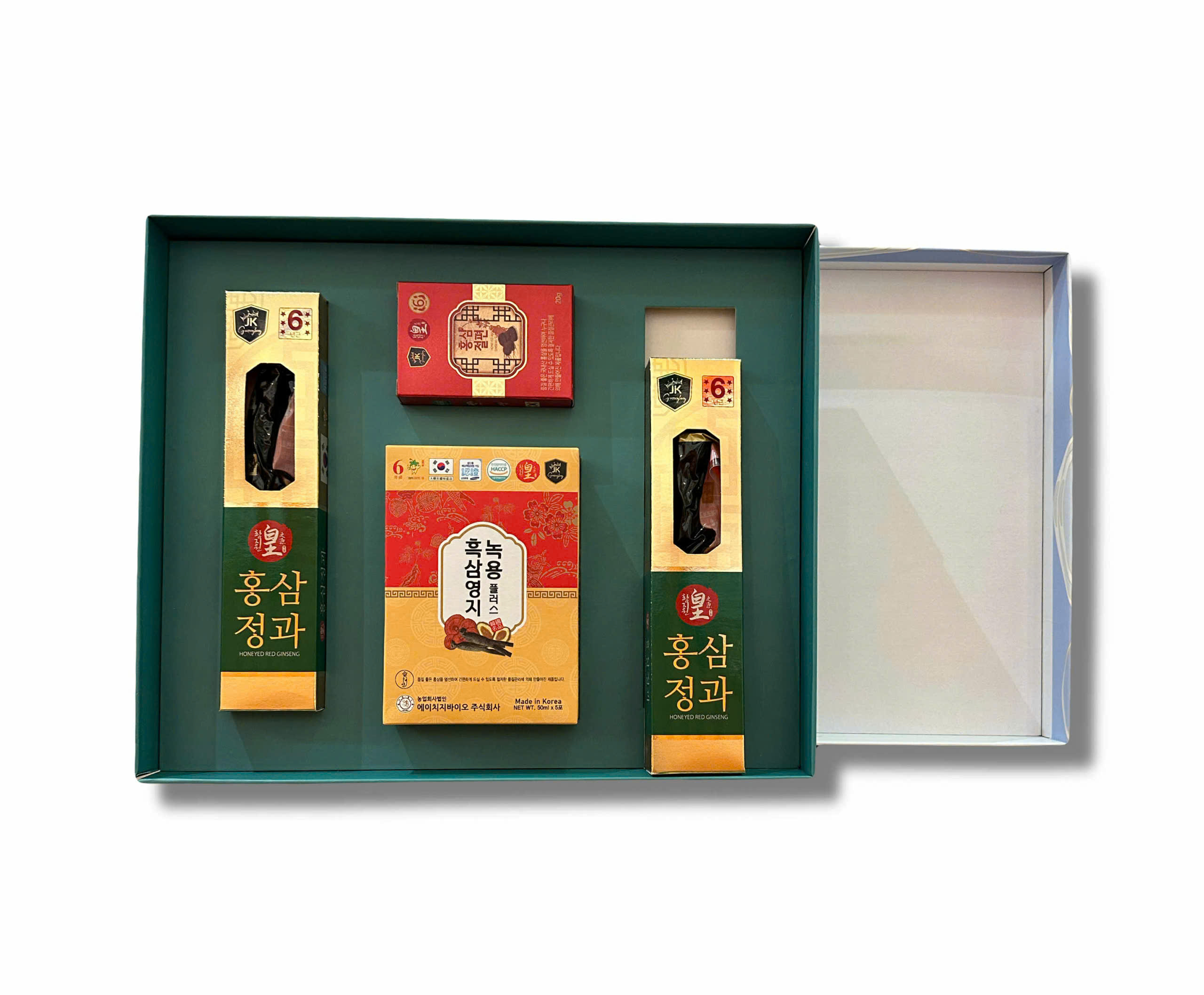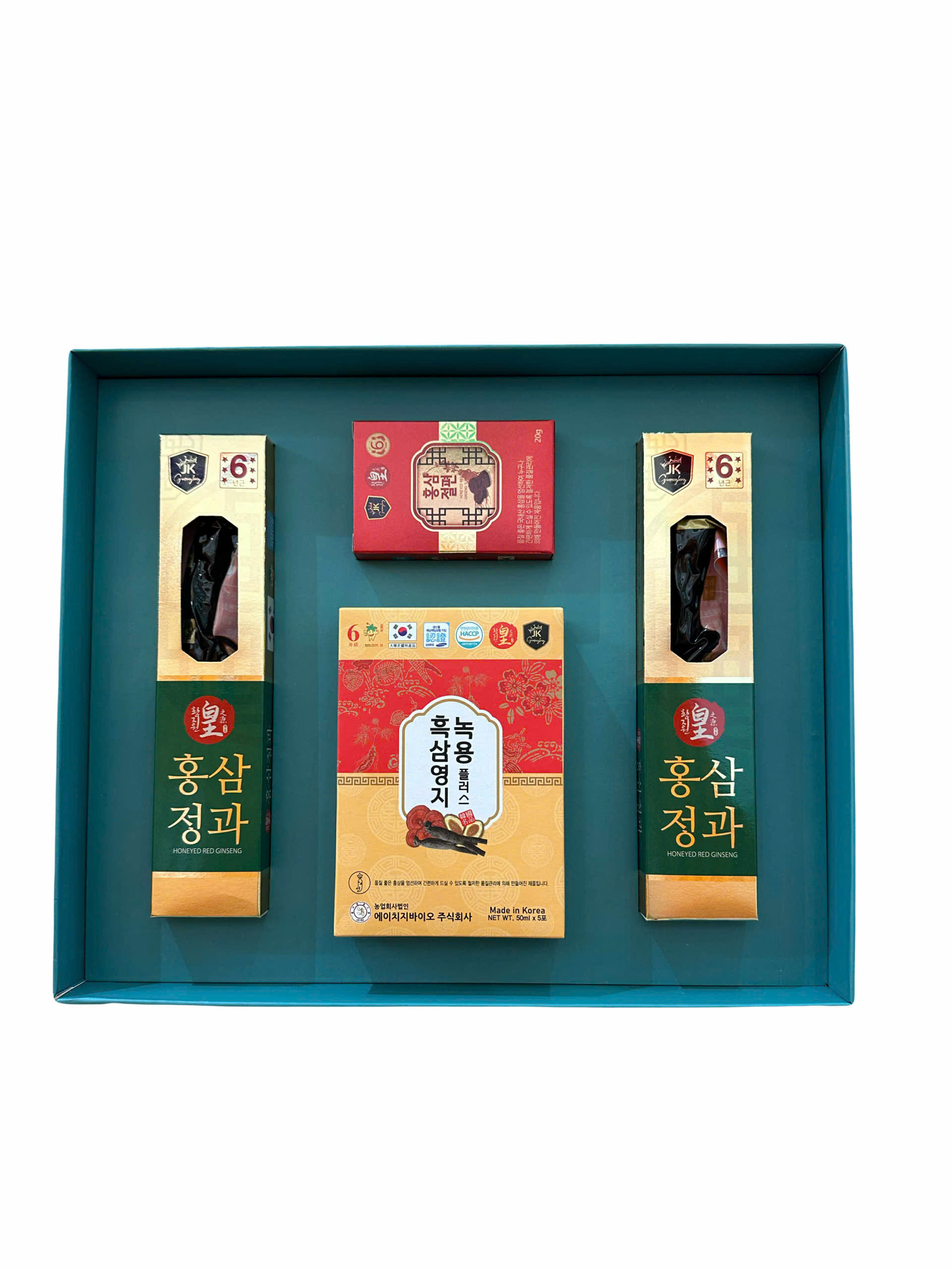 Bao gồm 4 sản phẩm trong 1 hộp Gift Set: 2 sâm củ ngâm mật ong, 1 hộp hồng sâm lát mật ong và 1 hộp hồng sâm gói nước